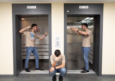 Eine kreative Fotomontage, bei der eine Person mithilfe von Bildbearbeitung mehrfach in einer Szene dargestellt wurde. Diese Technik wurde genutzt, um visuelle Geschichten oder surreale Effekte zu erzeugen.